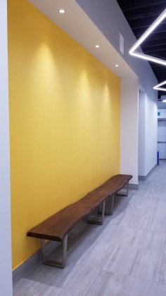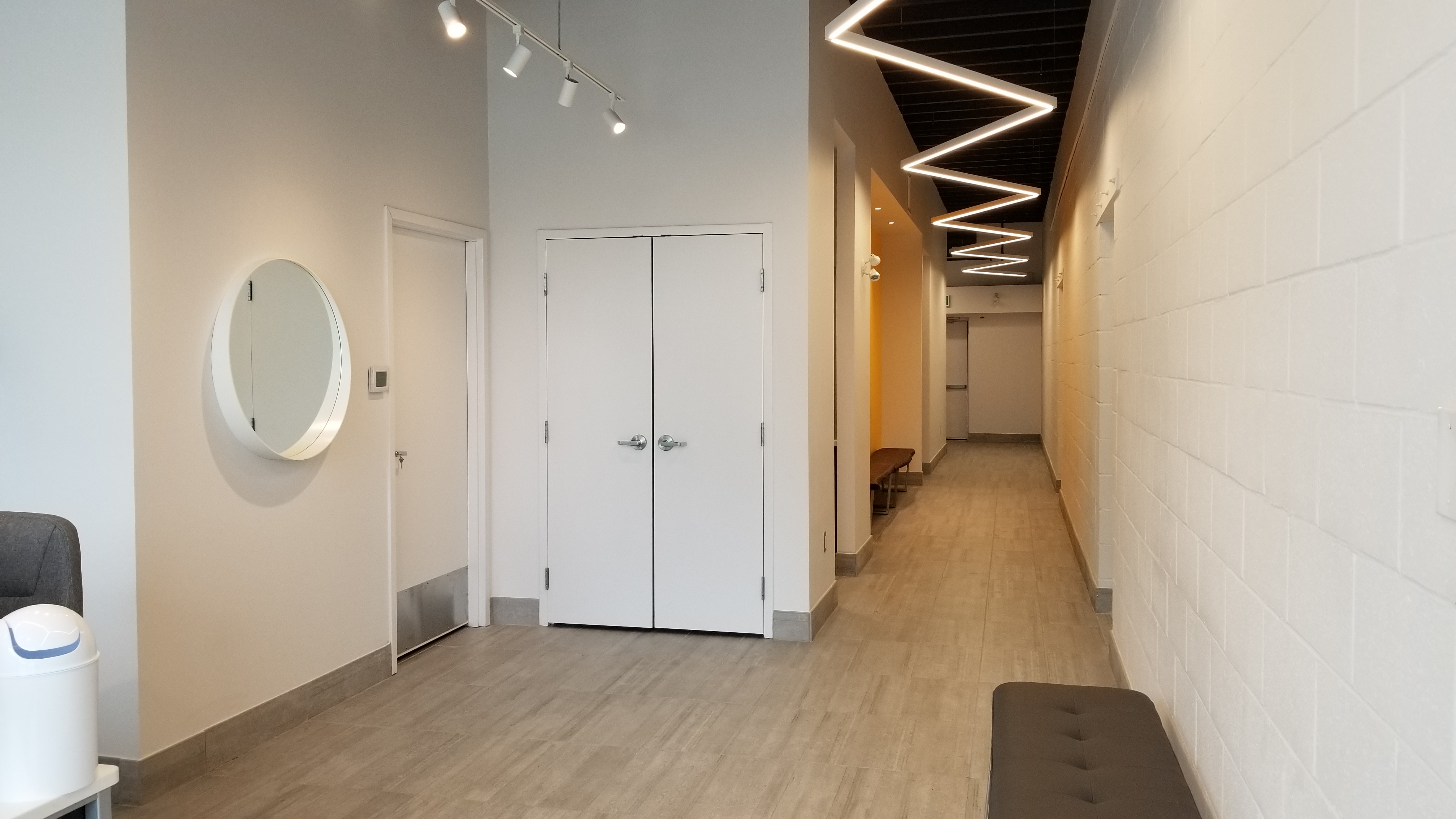 The space was originally 2 separate commercial units, now combined into one. The dance studio imbues a clean, sleek and contemporary look. The monochromatic style is enhanced by pops of their signature mandarin-like colour. The black painted ceiling highlights the zig-zag lighting that races down the transitional space between auxiliary areas and dance studios.